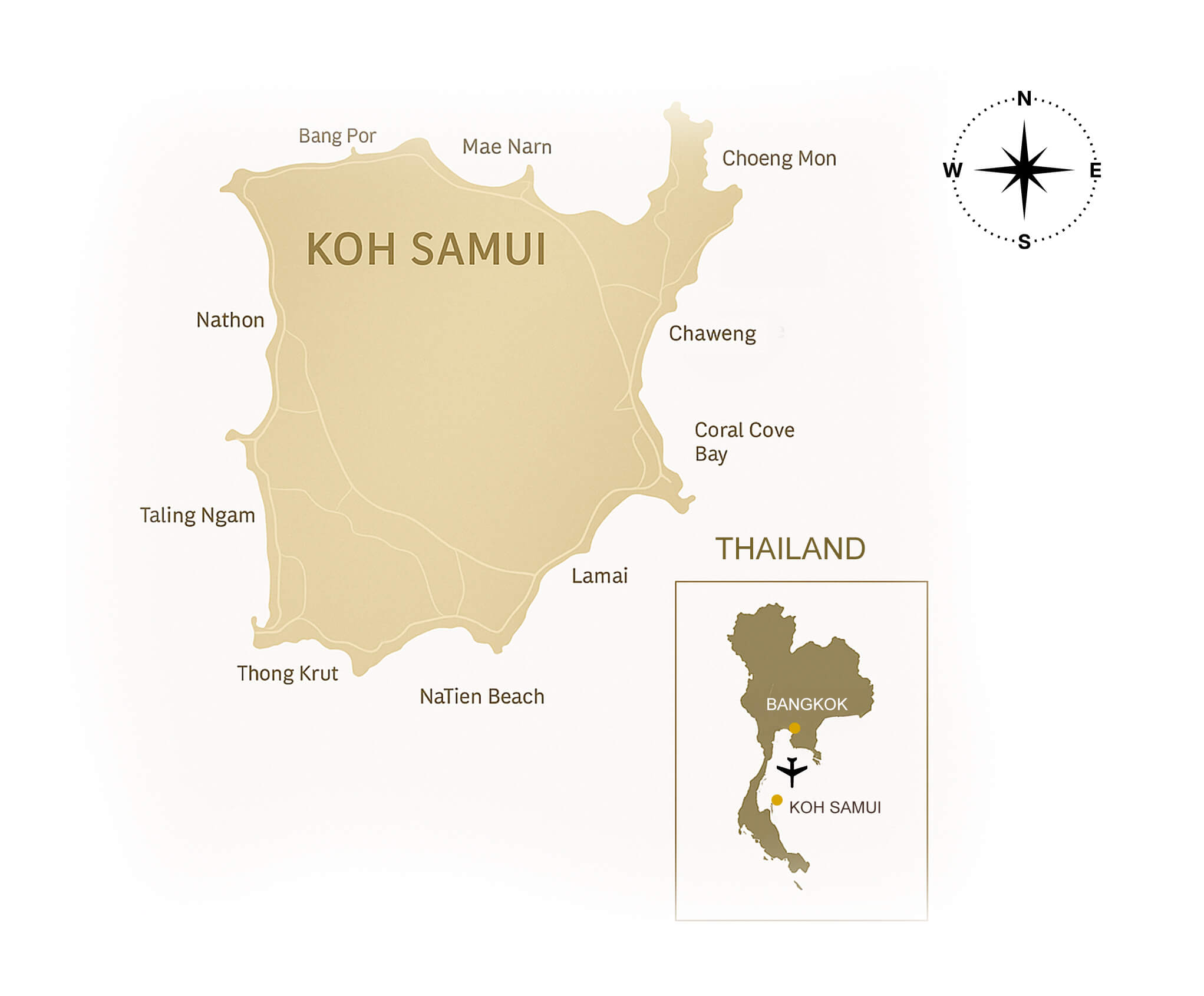 Naše nehnuteľnosti sa nachádzajú v Thajsku v tých najatraktívnejších častiach ostrova Koh Samui – v lokalitách, ktoré harmonicky prepájajú tropickú prírodu, blízkosť pláží a kompletnú občiansku vybavenosť. Každé miesto je starostlivo vybrané s dôrazom na súkromie, pokoj a zároveň pohodlný prístup ku všetkému, čo potrebujete – od obchodov, škôl a zdravotnej starostlivosti až po reštaurácie, trhoviská a wellness centrá.