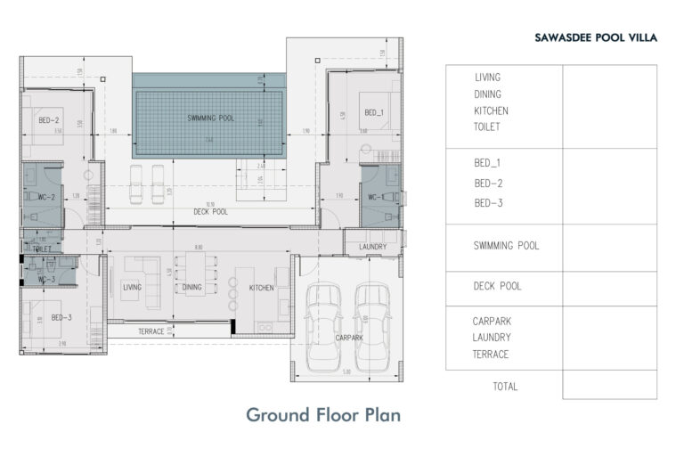 Vila je navrhnutá s dôrazom na každodenný komfort a estetiku. Tri samostatné spálne s vlastnými kúpeľňami ponúkajú dostatok súkromia pre každého člena domácnosti či hostí. Priestranná obývacia izba je plynule prepojená s jedálňou a kuchyňou s ostrovčekom, z ktorej sa otvára výhľad do záhrady a k súkromnému bazénu. Nechýba ani samostatná toaleta pre hostí, technická miestnosť, sklad a kryté parkovanie pre dve vozidlá.