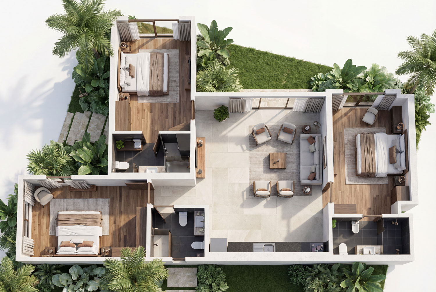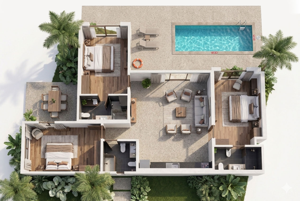 Elegantný tropický dizajn, súkromný bazén, uzavreté rezidenčné bývanie.